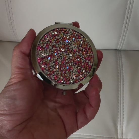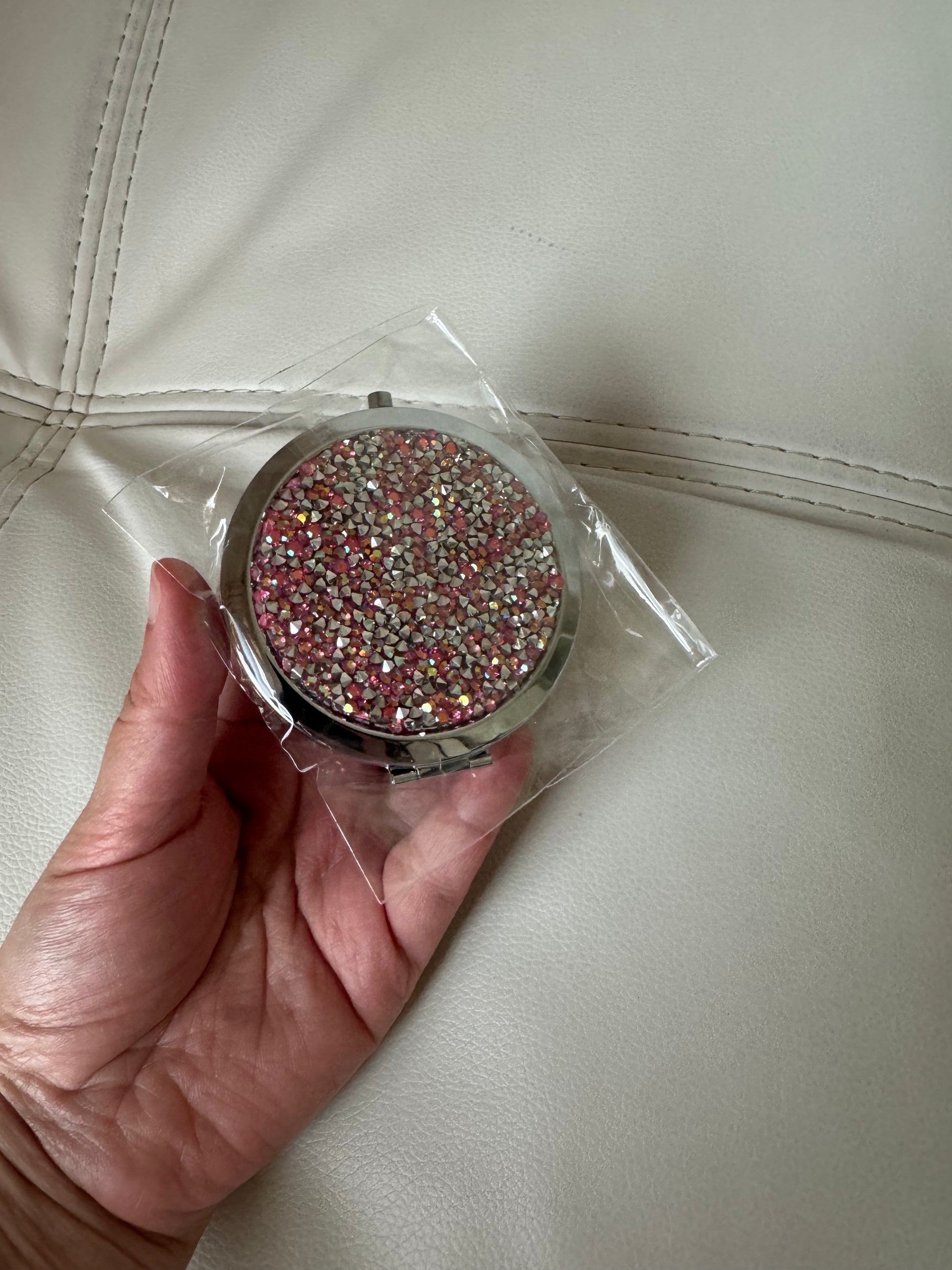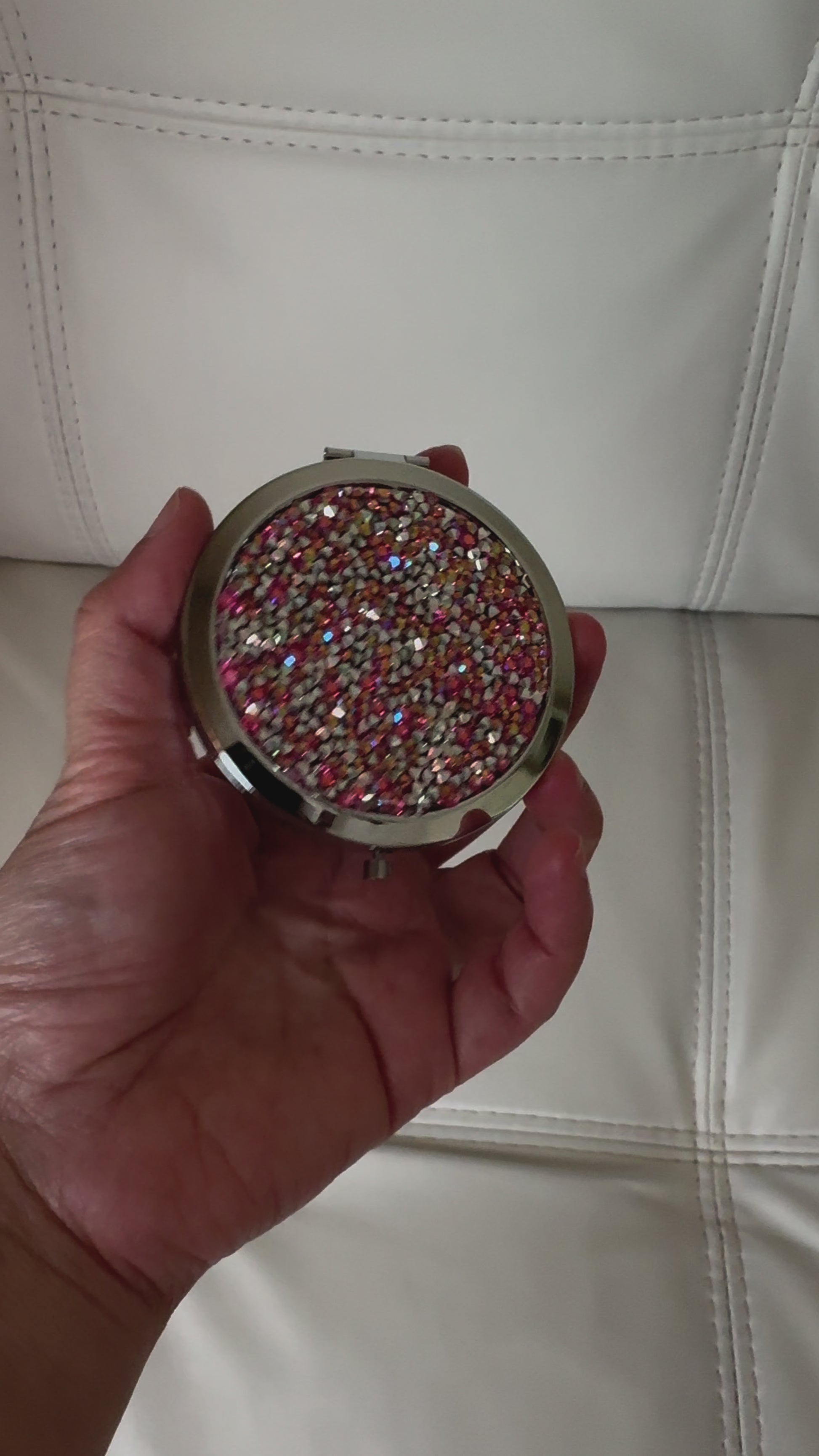 Our gorgeous pink rhinestone compact mirrors are small and easy to use. The base is silver while the top is inlaid with small pink rhinestones. Portable, stylish, and matches perfectly with our pretty pink cosmetic bags.